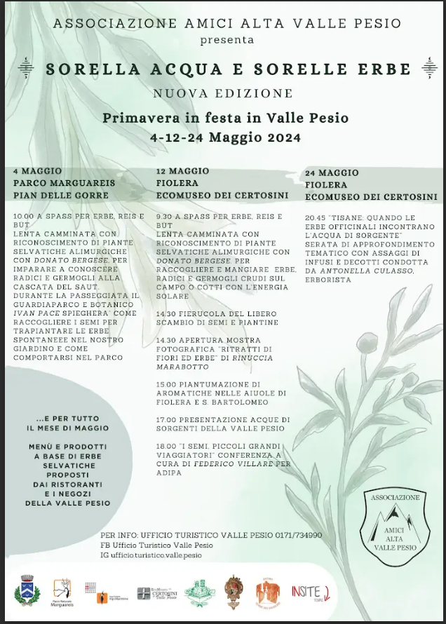 Per tutto il mese di maggio, in Valle Pesio, si festeggia con la manifestazione "Sorella acqua e sorelle erbe", organizzata dall'Associazione Amici Alta Valle Pesio.