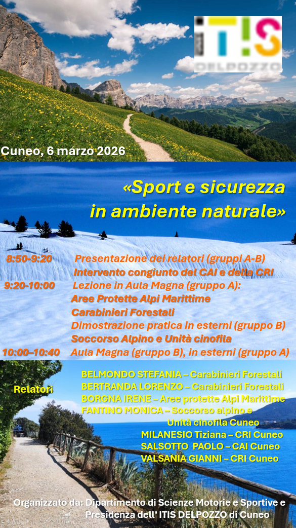 Il progetto "Sport e sicurezza in ambiente naturale", promosso dall'Istituto e portato avanti grazie all'impegno e dalla passione dei docenti, rappresenta il seguito di una bella tradizione inaugurata già da qualche anno. Oltre alla parte in aula, nel 2026 prevede una formazione pratica su primo soccorso e BLSD a cura del dottor Giamello e dei suoi collaboratori dell'Ospedale Santa Croce di Cuneo, un'uscita multisport di tre giorni all'isola d'Elba e un "gran finale sul campo" nel Parco delle Alpi Marittime al termine dell'anno scolastico, con un'escursione guidata da Terme al Pian del Valasco in collaborazione con il rifugio omonimo per mettere alla prova le competenze apprese a scuola.